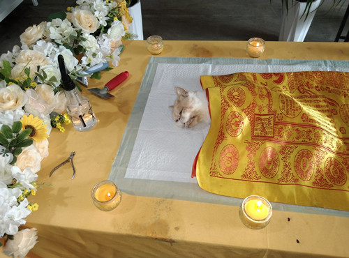 眯眯:真菌性重症猫藓,段段续续发作和治疗半年,还是于九月二十二号去世并且火化,在佛堂过完头七后再送回宠主手中安置。